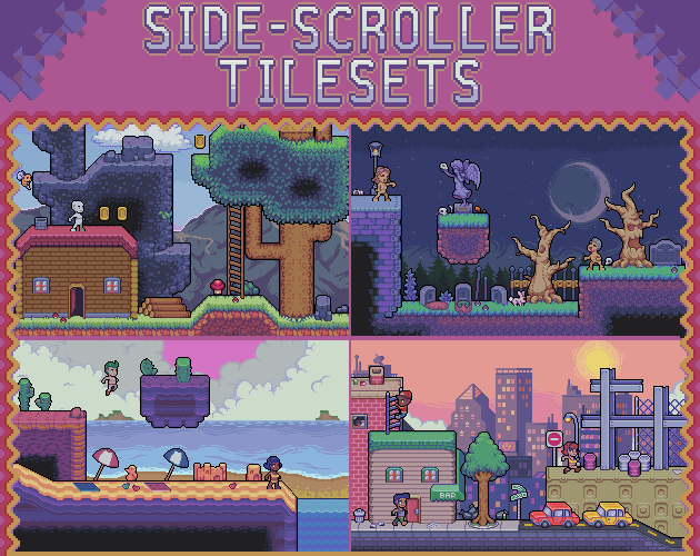 Are you looking to make a game with a unified and consistent art-style? Then this is the pack for you! This pack will include everything you need to make your own Side-scrolling game, all made by hand in with my art-style! If you are looking to make a Platformer, Action RPG, Metroidvania or anything in-between, this pack has everything you need to get started, including: